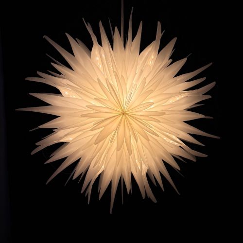 Bring Scandinavian style into your home with this handmade, light-permeable paper snowflower/snowflake star (45 cm). Crafted from high-quality, milky white paper for a beautifully diffused lighting effect. Supplied with a 3-metre white lighting cord (E14 fitting, with switch), bulb not included.
