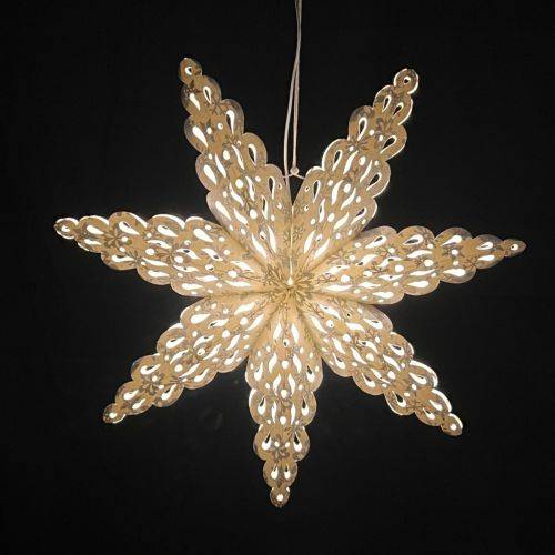 Unenlightened, this paper lamp is already beautiful. But with illumination the lamp comes to life at night. You can see the difference in the pictures: with a dark background the star is lit; with white background unenlightened.